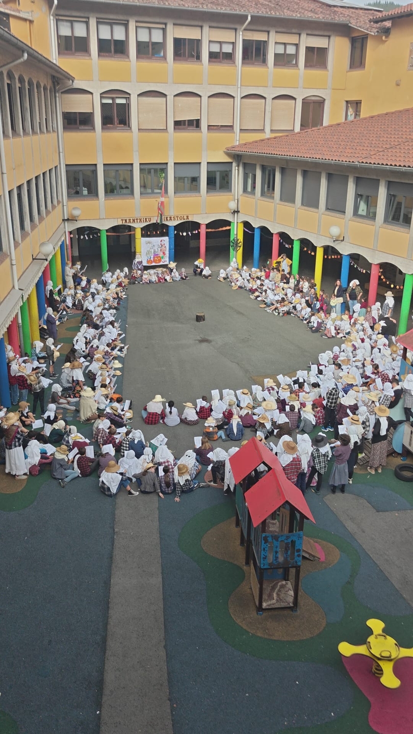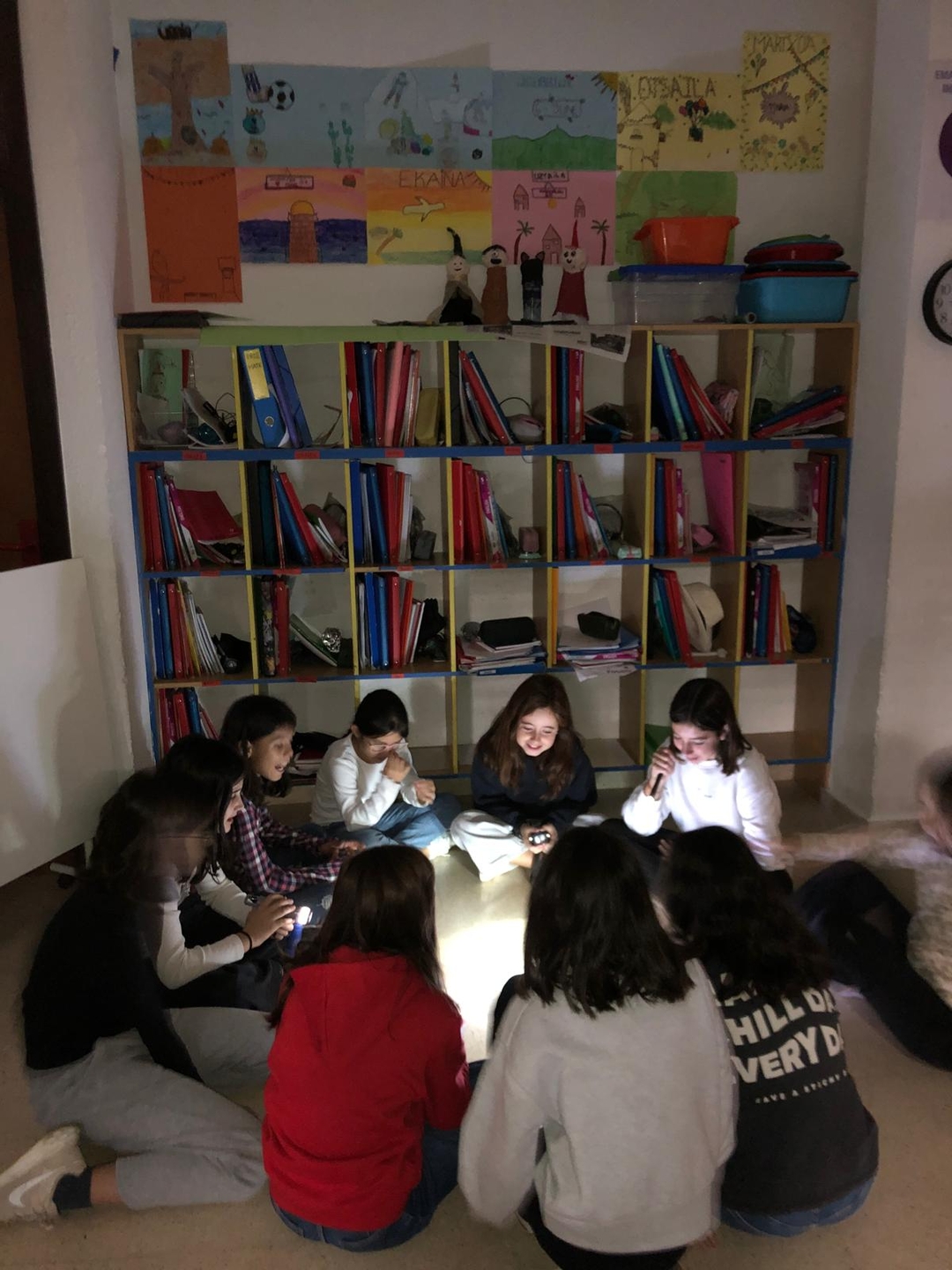 Gaur goizean, gelan, marrazkiak, jolasak, ipuinak eta bestelako ekintzak egin ditugu. Arratsaldean, berriz, etxeko trapu zahar eta oihalekin mozorrotuta etorri gara ikastolara. Jaia ospatzeko, Lehen Hezkuntzako maila guztietako ikasleok ikastolako patioan elkartu gara. Bertan, gai honek sortarazten dizkigun beldurrak erre eta barrenak lasaitzeko errituala egin dugu. “Xanduli-manduli kirirriki, eman gaztainak guri!” abestu dugu eta, jakina, gaztainak ere jan ditugu. Ederki ibili gara!