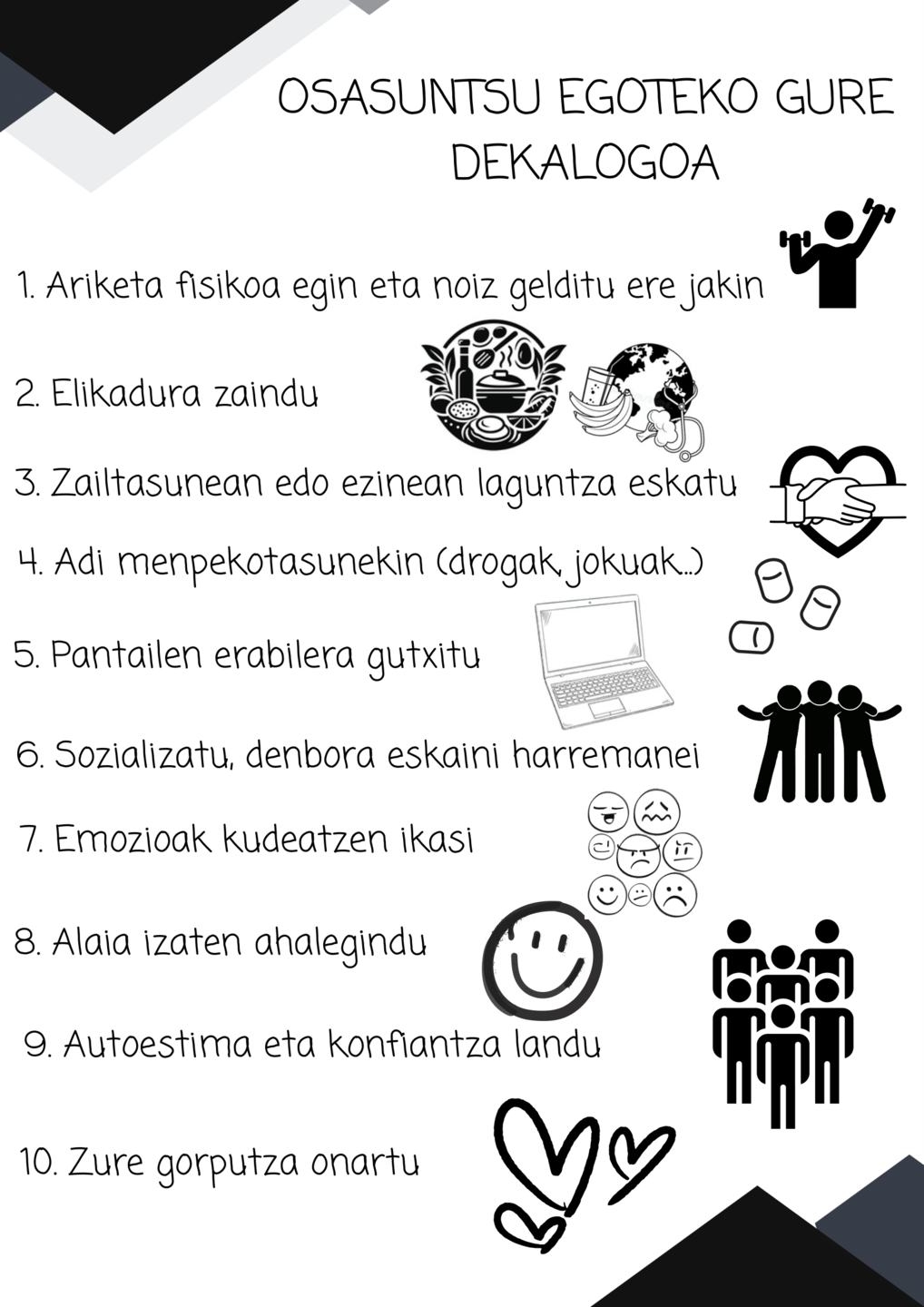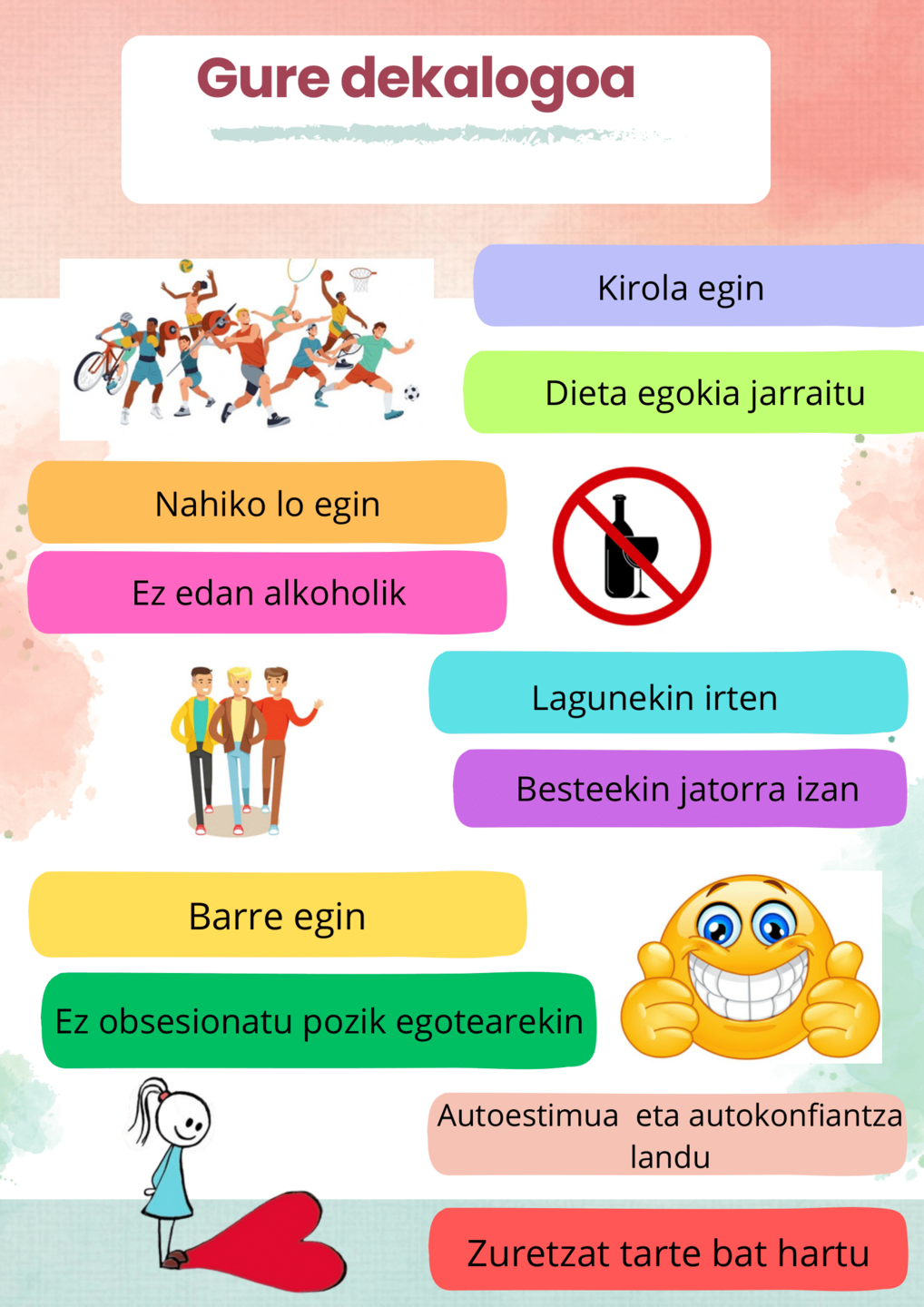 Izan ditugun ideiak geletako dekalogoan batu ditugu (azpian ikus ditzakezue). Orain bertan jasotako ideiak praktikara eramatea dagokigu! Bestalde, dekalogoetako arauak kontutan izanik, dominen erronka ere burutu dugu. Bertan, talde lana bultzatuz, taldean hainbat erronka bete ditugu; adibidez, patinetan ibili, yoga egin, elkarri mezu positiboak idatzi...