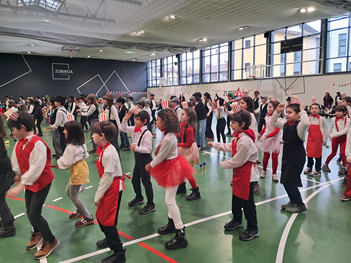 Bestalde, gaur arratsaldean, HH eta LH-ko ikasleek ez dute eguraldia lagun izan eta kiroldegian egin dute beraien urteroko desfilea. Zirku aparta eraiki dute kantxa berdean! Ez da musika ez dantzarik falta izan bertan. Ondoren dantzaldia egon da Gauargiren eskutik, eta txokolate solidarioa ere banatu da; batutako dirua Arberoa Ikastolara bideratuko da. Gora inauteriak!